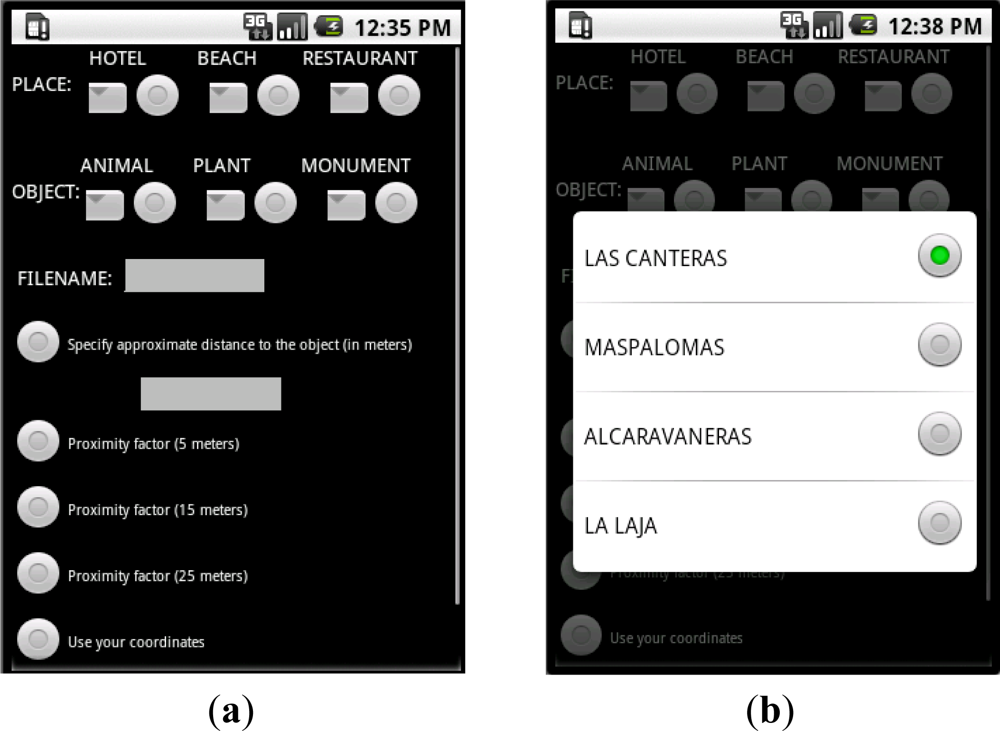 The User Interface used to add the needed data in order to begin the recording process and tagging is shown in Figure 1(a,b). As shown in this prototype application, the user must enter on where he/she is and what kind of object he/she thinks of recording. There are different options for each object type and location. The user must also specify the name of the file to be generated after the recording and tagging. And he/she must indicate the distance between the object and the mobile phone’s camera using a specific value or by choosing a particular approach factor (5, 15 or 25 m). These data will be used in the tagging process later.