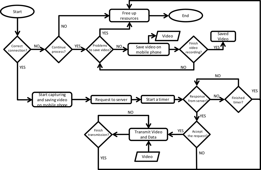 Figure 10 shows the algorithm used to improve the request process. The explanation of the designed algorithm is as follows. The first step performed by the device is to check if it has an appropriate connection to perform the task. If the connection has not enough available bandwidth, the system lets the user to decide to continue or end the process. If the user chooses to continue, the device will store the tagged video in memory and the storage process will be controlled continuously (in order to check the available memory). The stored video can be sent to the server when there device has better connection. When the device checks that it has enough available bandwidth it begins the video capture and tagging processes. Then, a RQ packet is sent to the server and a timer is activated. This timer is used to check the reply of the server. If the mobile device does not receive a reply, it will finish the capturing process or stores the tagged video in memory. If the server replies, the device will start the transmission of the tagged video till the capture is finished.