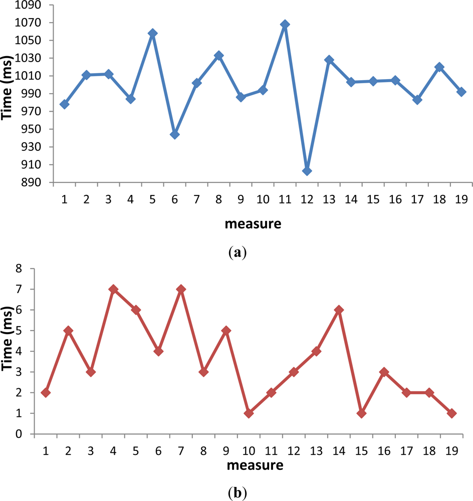 We measured the values of TGPS using a satellite (we do not use the combined method of GPS and WiFi). The minimum time spent in scanning the GPS value was 903 ms and the maximum value was 1,068 ms. The mobile phone scanned different sets of 19 values with similar results. The average value was 1,000 ms. That is, the time needed to scan the GPS value is 1 s. This is a bigger value than 40 ms. This means some images must be tagged with the same GPS value. The TRGPS is insignificant compared with the TGPS due to its values are in the interval from 1 ms to 7 ms, with an average value of 3.5 ms. In Figure 11 (a,b) are shown these sets of values.