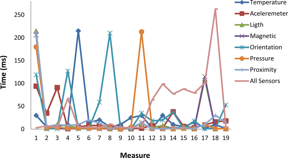 In Figure 12 we show the difference between the values of TSen measured in two consecutive reads for the following sensors: temperature, accelerometer, orientation, light, magnetic, pressure and proximity. In addition we also show the time needed to read simultaneously all the sensors. Some interesting points must be highlighted: The major values are concentrated in the interval from 1 ms to 30 ms. That means the latency of the measurement of consecutive values is in the normal case very low. We also show that there are several values in the approximate interval from 100 ms to 120 ms. This means that in several cases the latency is around 115 ms what means that consecutive images must be tagged with the same value of the sensor. Only a few values are greater than 150 ms and lower than 220 ms. When all the sensors are read the same shape of the curve is obtained. But in this case a very high value is found for the 18th measure. The conclusion is that the Android software introduces a variable time to read the sensors which implies to repeat the value of the sensor for several consecutive images.