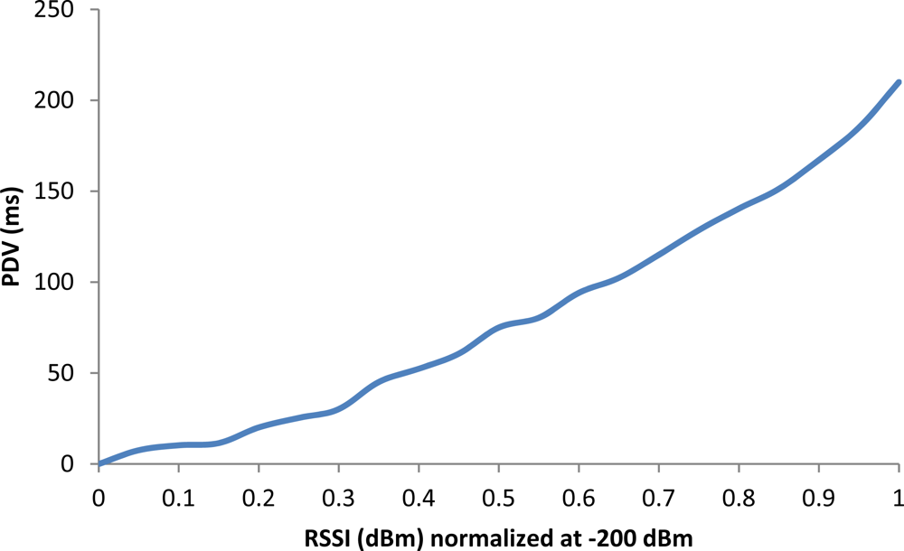 The most important factors that affect the PDV are undoubtedly congestion or channel bit rate (due to the noise, multipath, mobile phone is far from the WiFi Access Point, intermittent disconnections...). This leads to packet losses or to a relatively large difference between the time of transmission of a packet and the time of receipt. If there are no disconnections, when the delay of packets increases, the PDV will increase. Thus, if a user is downloading a file, the waiting time will increase proportionally to the increase of PDV. On the contrary, if disconnections occur, unless there is an attention mechanism to them, we must forward the video and its tagging file again starting from scratch. In this case, the time the user must wait will increase, but the delay between packets will depend only on the channel conditions. The variation of packet delay grows exponentially as the RSSI decreases its value, which corresponds to a WiFi signal level received less, and therefore slows down the operation of the application (Figure 14).