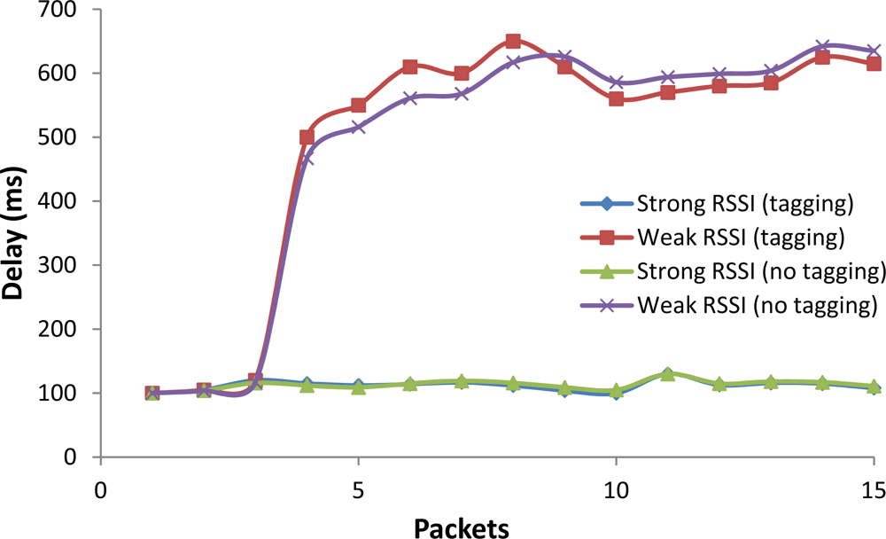 Figure 15 shows the delay of packets. Let us analyze the case of Weak RSSI. The three first packets had low delay but it increased for packet fourth to 500 ms. Then the delay maintained a constant interval of values around 500 ms and 650 ms. The differences between tagged and non-tagged video are minimal. We have obtained low delay values for the case of Strong RSSI (the average delay was around 100 ms). The case of Strong RSSI is the optimal one since the mobile phone is well connected to the Access Point, no packet loss, no intermittent disconnections…. Again, the differences between tagged and non-tagged video were minimal.