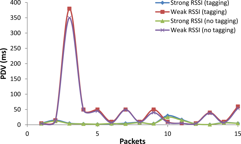 In Figure 16 are shown the values of PDV for Weak and Strong RSSI cases. For Weak RSSI, the PDV for the third packet is around 350 ms. The PDV for the next packets is small. This pattern is practically the same for tagged and non-tagged video packets. The average PDV for tagged video packets was 50 ms, and the average PDV for non-tagged packets was 45.5 ms. For Strong RSSI, the PDV was very low for both tagged and non-tagged videos (the average PDV is 7.5 and 6.2 ms respectively).