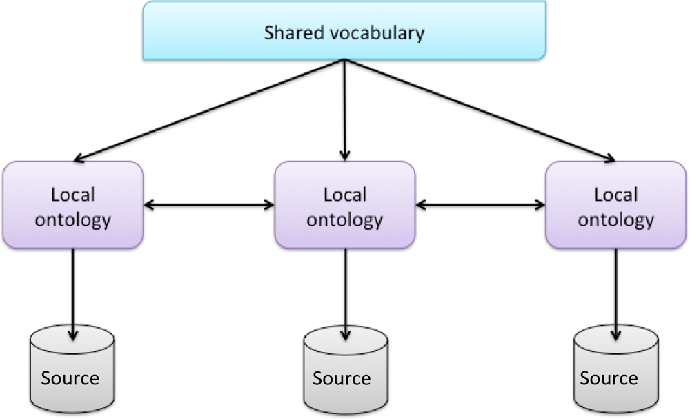 According to [44], there are different ways to employ the ontology. In general, three different directions can be identified: single, multiple and hybrid ontology approaches. Our system is based on a hybrid approach (see Figure 2). Each source is described by its own ontology. But, in order to make the source ontology comparable to each other they are built upon one global shared vocabulary. The shared vocabulary has primitives of the same domain.