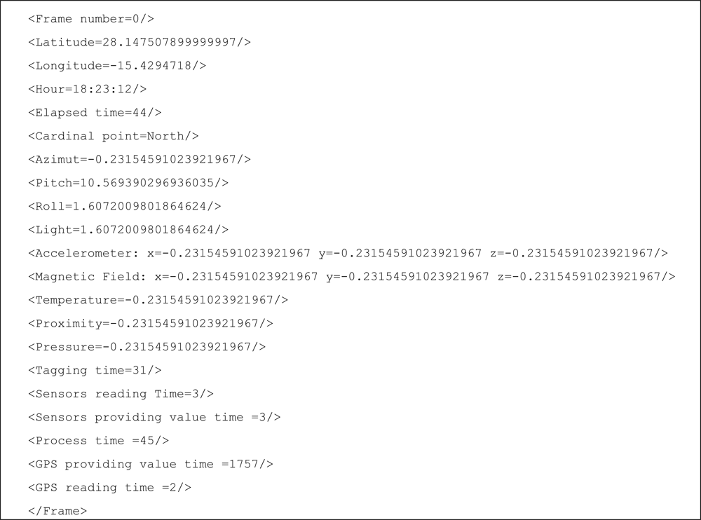 Each frame of video (or a set of frames depending on the processing power of the mobile phone) is tagged with the values of the sensors the user wants to include. Each sensor has a tag named with the name of the sensor and an attribute that contains its value. Moreover we include the time in which the frame was captured by the video camera and the GPS value. In Figure 3 an example of tagged video frame is shown.