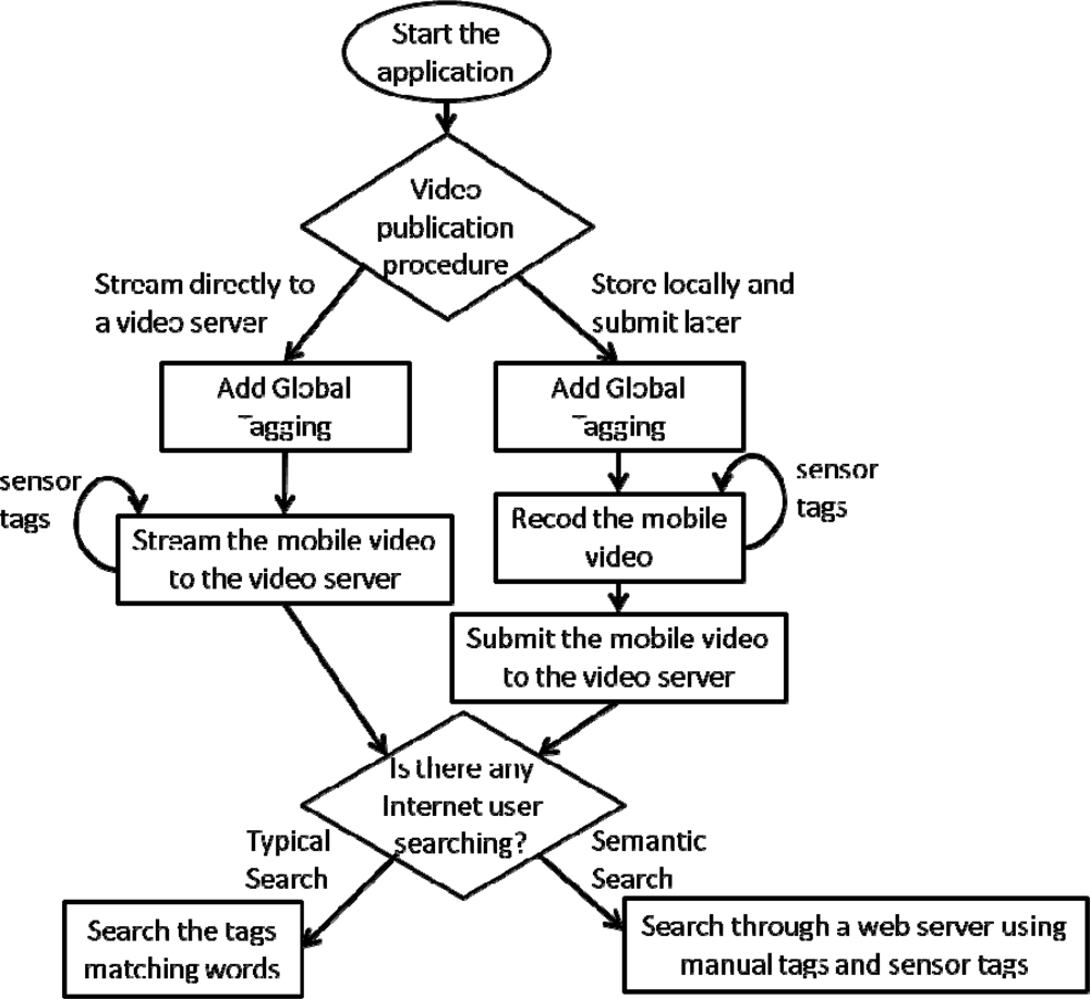 The implemented mobile application allows users to record videos and tagging them with semantic sensor data. This extra information is associated with each of the images composing a video recorded from a mobile phone, allowing users to exploit this information when sharing tagged videos. Specifically, the process consists in geotaging each physical object represented in the images that form a video and also obtain useful measurements of the mobile phone’s sensors for each image. All these data are stored in an eXtensible Markup Language (XML) file. Therefore, each recorded video file is associated with tags. The tagged video is stored in a single multimedia container that can be stored locally on the mobile phone or streamed to an Internet video Server. Then, the files can be shared with other users by accessing to the server. The users can also search for videos on that platform (Internet video Server), according to a certain semantic criteria, based on data that are in the tagged files of the shared videos.