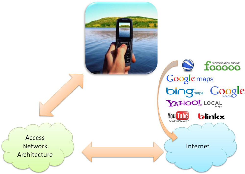 Figure 6 shows a schema illustrating the process. The mobile phone is connected to a wireless access network. The performance of the wireless network must support the tagged video transactions in real time. Moreover, it must be able to access the Web services specified in the figure in order to let the mobile user store the mobile video in the servers (let us remember that the trends in mobile phones are to allow the user to act easily with these kinds of servers: for example, currently it is possible a mobile user stores a mobile video in YouTube with a simple click) or even add an image in a location of the Google Maps. This type of procedure provides an easy-to-use system. In the experimental results shown in Section 5 we use our server to test this proposal and we are researching the way to upload the tagged videos to public servers.