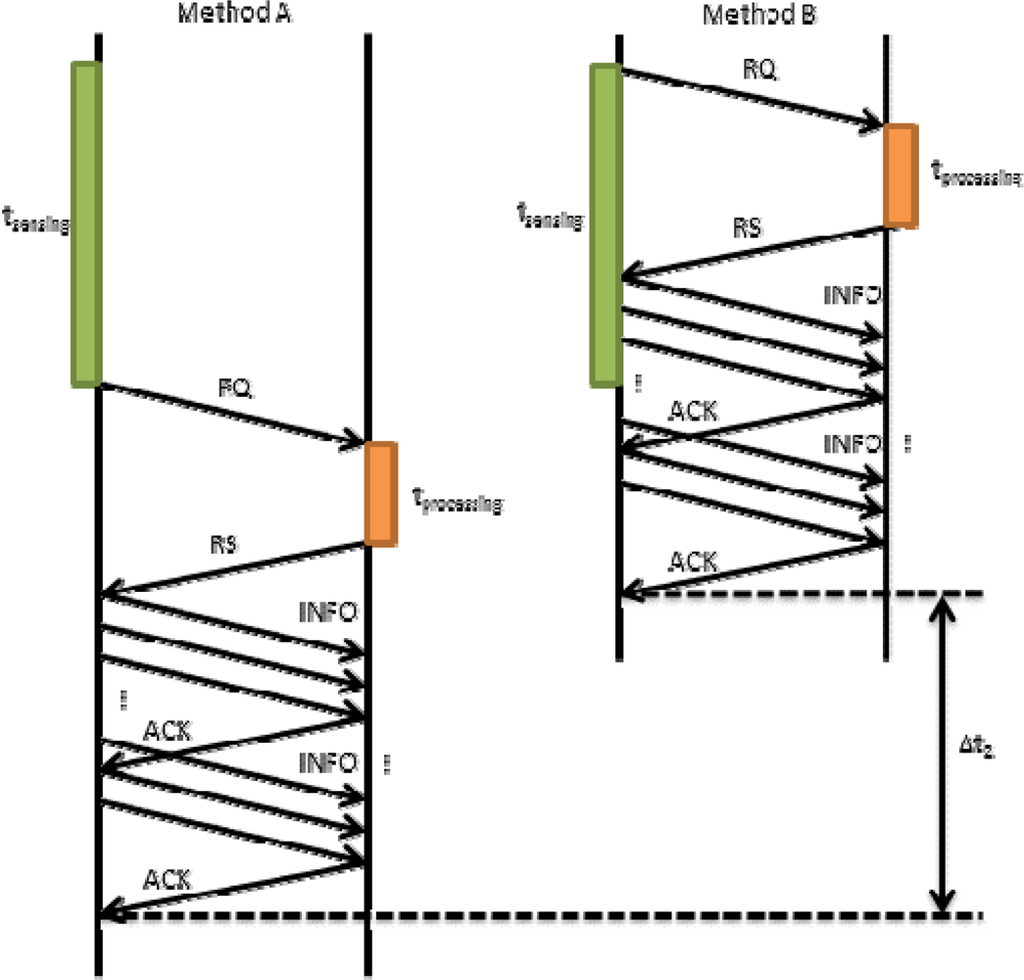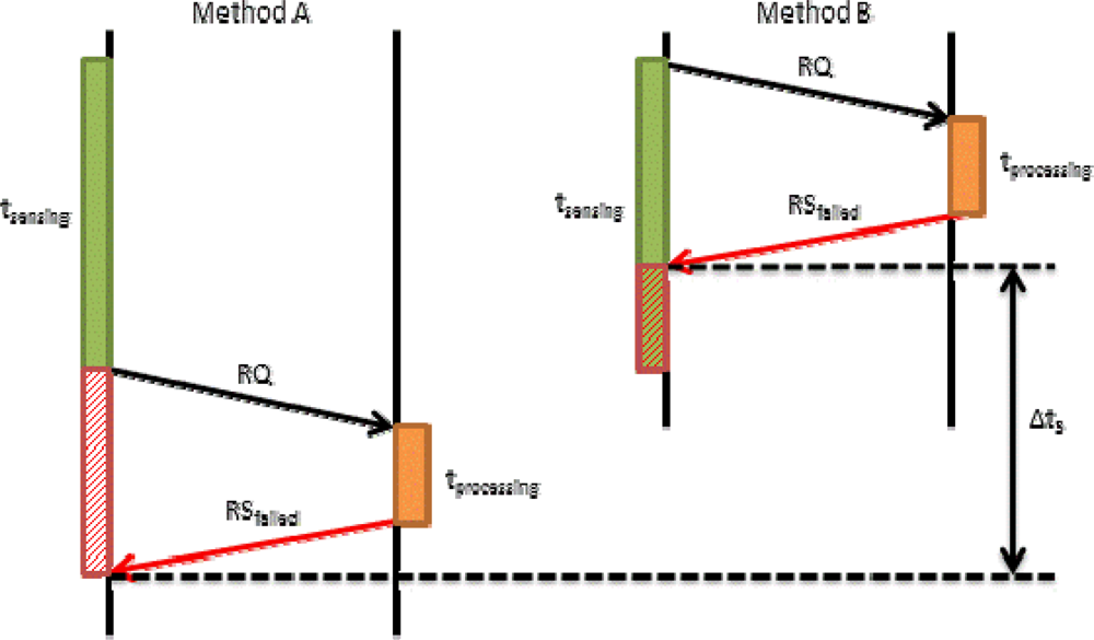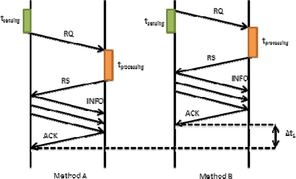 In Equation (2) we have seen that tpropagation also involves tRQ. This time may affect to the final time in our proposal. Figure 7 shows how tRQ affects the request process when there is a short sensing time. On the left we show Method A, in which the device firstly senses the data and then sends a request packet (RQ) to the server. Finally, the server processes the request and sends a reply. If this reply is OK, the mobile device will send the tagged video to the server. In this case, the request time is tRQ_Meth_A. On the right we show our proposed method (Method B). It allows improving the system in terms of time. The mobile device sends the RQ packet immediately after starting the sensing process. Then, the system follows the regular designed steps. We can observe that request time is shorter. In this case, the request time is given by Equation (9):