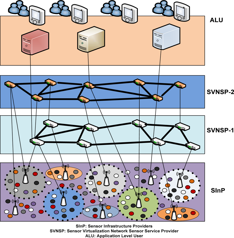 ALU Application level users (ALUs) in the VSN model are similar to those of the existing WSNs, except that the existence of multiple SVNSPs from competing SInPs provides a wide range of choice. Any end user can connect to multiple SVNSPs from different SInPs for using multiple applications.