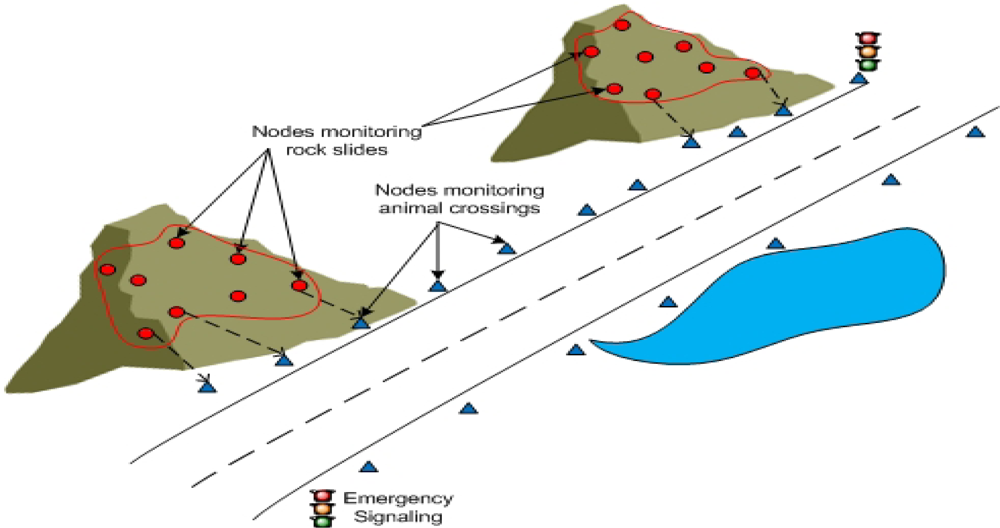 VSNs can also be used in the application like rock sliding and animal crossing monitoring. Figure 5 represents a mountain terrain where there are different types of animals crossing a road.