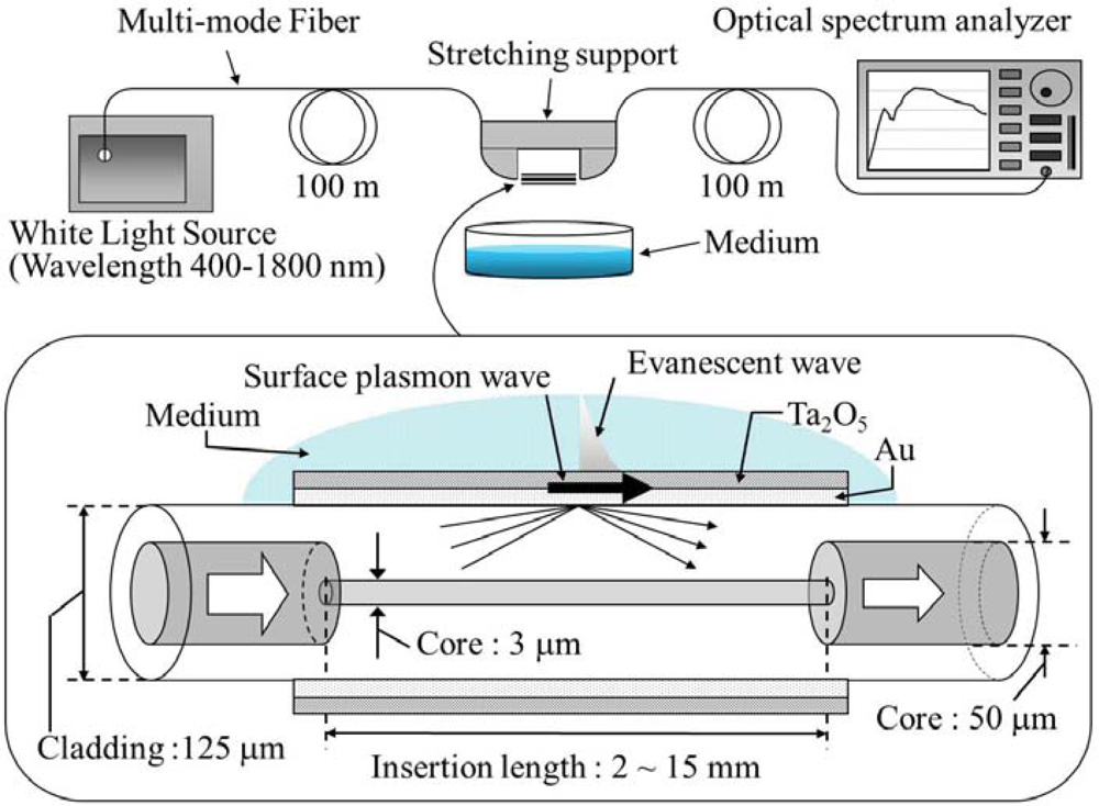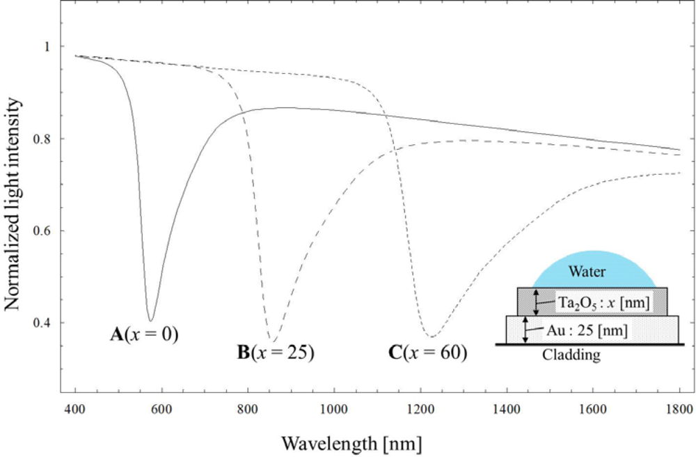 On the other hand, it is known that most of SPR sensors could be operated in the visible range in an aqueous environment with a refractive index close to 1.33. In addition, optical fiber sensors based on SPR could also be operated in the limited wavelength in the range 600–700 nm under a similar environment [9–11] as well. This is because that SPR excitation condition is derived from the relationship between the thickness of thin metal film, the angle of incident light and the refractive index of silica. In contrast to those visible range operation, it was demonstrated by Homola et al. that the resonance wavelength of SPR excitation could be shifted toward longer wavelengths by coating a high-refractive index thin film such as tantalum pentaoxide (Ta2O5) [12,13] in addition to the conventional SPR metal coating. They demonstrated a SPR sensor operating at 825 nm for refractive index measurements of aqueous environments employing a Ta2O5 coated single-mode optical fiber whose cladding layer was removed [14,15]. Their results showed that the thicker the Ta2O5 coating the longer the operating wavelength becomes. An advantage would accordingly be obtained in a SPR fiber optic sensor working at the near infrared wavelengths over 825 nm extending to 1310 nm, where silica fibers shows lower transmission loss. In particular, the use of 1310 nm allows a flexible system arrangement using a versatile selection of LED light source and PD detectors.