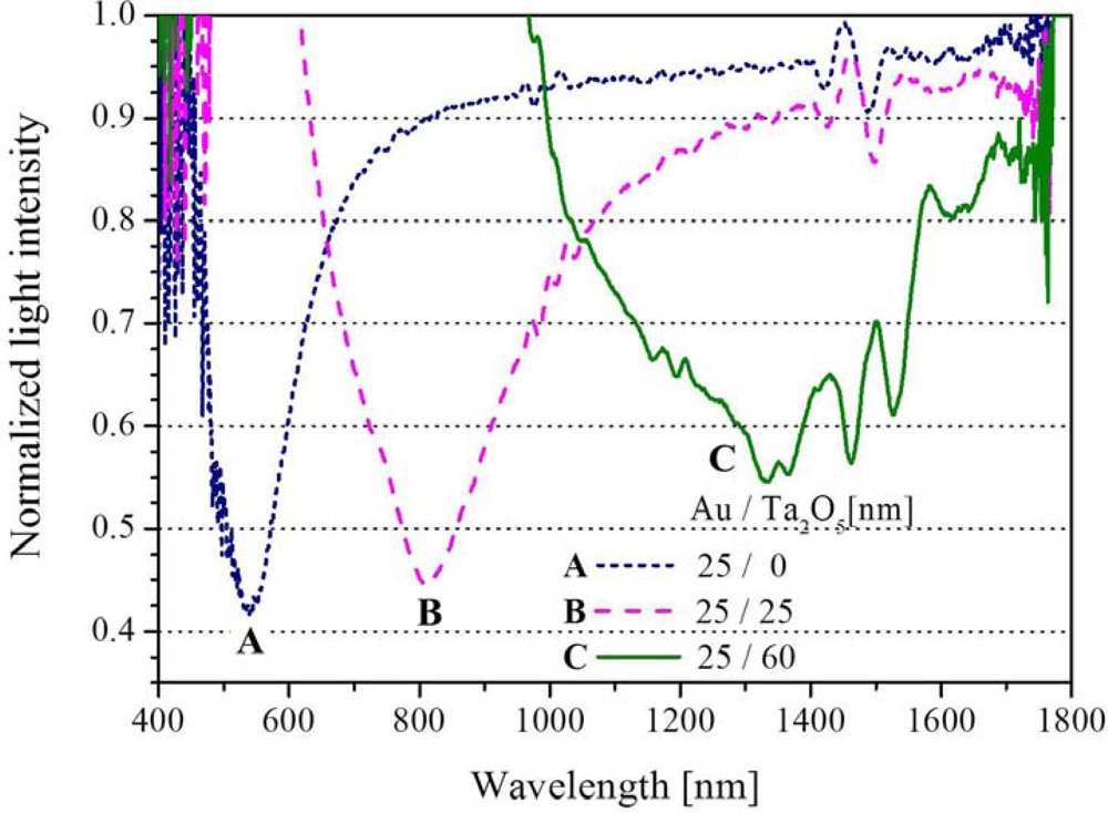 Figure 2 shows SPR spectra A, B and C experimentally obtained in the case of water for the sensors having Ta2O5 thicknesses of 0, 25 and 60 nm, respectively. These results are normalized with the spectrum for air. As the result of increasing the Ta2O5 thicknesses extending to 60 nm, the experiment shows that the resonance wavelength is largely sifted to the near-infrared wavelength region over 1,000 nm. Although each spectrum is somewhat uneven at the wavelength around 1,400–1,600 nm, this could be caused by an interference effect between longer wavelength modes when the light wave re-couples into the core downstream, since the same results can be appeared in the case of no coating hetero-core without water. Figure 3 shows theoretical SPR spectra based on multi-layered model [19,20] for three Ta2O5 thicknesses, assuming that there would be a multi-mode distribution [17,18] with the corresponding incident angles in the hetero-core structure. The refractive indices of each layer at 1,310 nm are given as Au: 0.413 RIU, Ta2O5: 1.888 RIU using the wavelength dependence previously reported [20,21].