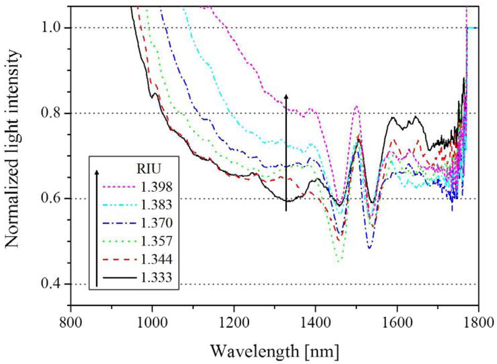 These results were normalized with the spectrum for air. The resonant absorption in the wavelength range of 1,000–1,400 nm decreases with the increase of refractive index, showing that the same interference effect as in Figure 2 appears in the 1,400–1,600 nm range. As can be seen from Figure 4, probably because of such interference effect, the intensity change in the wavelength region longer than 1,300 nm is heavily disturbed in a complicated manner, hence with an ambiguous resonant shift. The sensitivity can be derived as 1.3 dB per 0.065 RIU at 1,310 nm. The sensitivity obtained is comparable to that in the previous works [10,11,17,22]. The data accordingly shows that the wavelength-shifted hetero-core scheme can be used more favorably as liquid detection, rather than as a refractive index (RI) measurement. The obtained experimental results indicate that an attractive liquid detection sensor could be realized for liquids with refractive indexes of 1.333–1.398 RIU such as water or ethanol.