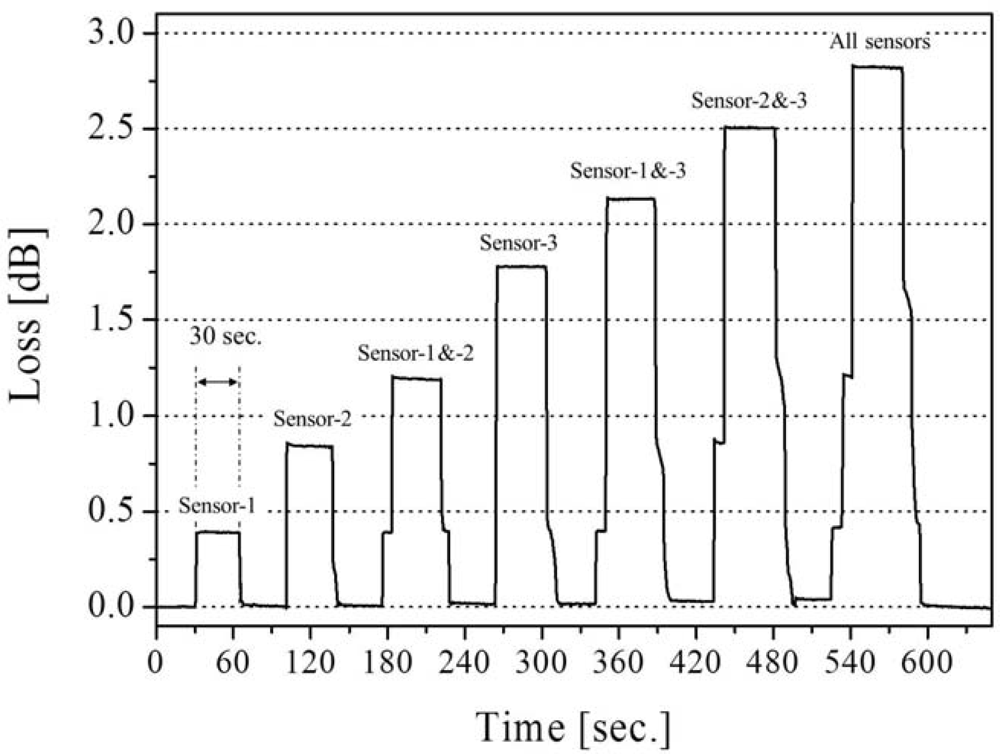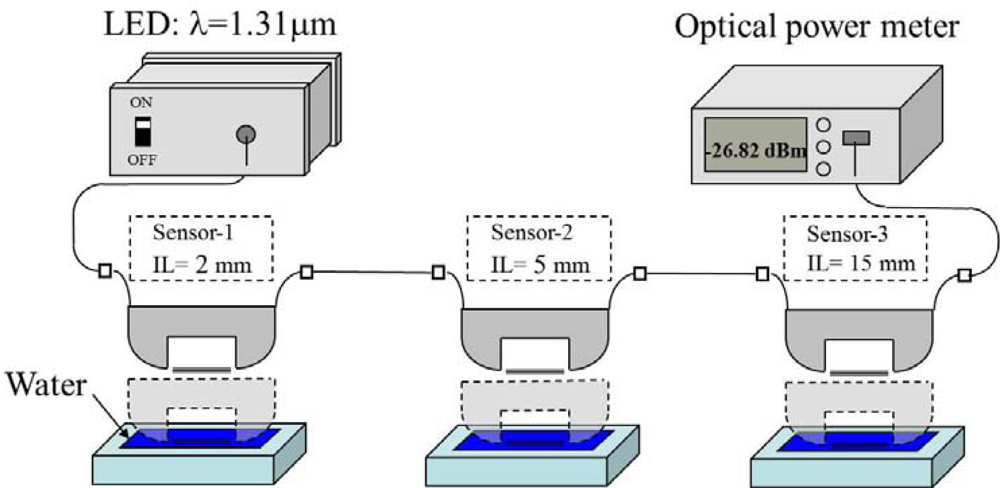 The absorption loss of the hetero-core SPR sensor can be reproducibly adjusted by changing the insertion length [23]. Since SPR interaction occurs effectively with longer insertion lengths, the sensitivity of the sensor is increased. However, the insertion loss is also increased. The insertion length thus shows a trade-off between sensitivity and insertion loss. Taking advantage of the flexible change of SPR loss, authors have developed a multi-point liquid detection system using three different sensors tandem connected in a single line, in which the three sensors can be identified. In order to separately interrogate the state of each sensor, specified losses were given to each sensor by tuning the insertion length. Sensor detection succeeded only with a combination of a light source of LED and a photo diode. Since this multi-point detection system uses no OTDR, hence no data averaging which is a time consuming process, the detection can be made on a real-time base. The experimental setup for multi-point liquid detection was arranged as shown in Figure 5, and consisted of three hetero-core SPR sensors connected in tandem, an LED (−19.5 dBm) whose wavelength is 1,310 nm as a light source and an optical power meter (PD: OP710, Opto Test Co.).