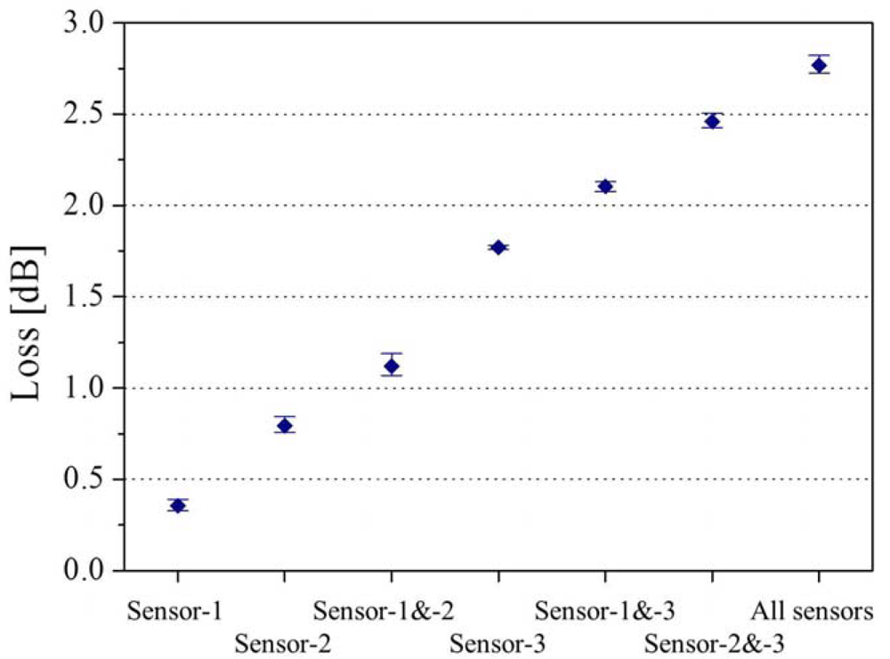 The output from the LED was guided into a transmission fiber and finally introduced to the PD through the three sensors. The insertion lengths (IL) of the three sensors, denoted as sensor 1, 2 and 3, are 2, 5, and 15 mm, respectively. In the experiments, seven detection patterns were tested as shown in Figure 6. Depending on the sensor combination, extinguished losses are indicated. The losses for each combination were measured as the optical intensity for 30-second, then all sensors were exposed to air for 30-second before the next test. In this way, the losses for all patterns were continuously changed in the order of loss increase with the sampling frequency of 1.67 Hz. Figure 6 shows the real-time response of optical loss change in all patterns. As can be seen, sensor combination is found to be shown as the different levels of loss. In order to evaluate the repeatability of the system, the average of optical loss of each pattern over five trials is shown in Figure 7, which shows that the loss detection is reproducible enough to find the sensor combination. As explained above, the feasibility of a multi-point liquid detection system based on LED-PD has been demonstrated by employing the hetero-core optical fiber SPR sensor coated with Au/Ta2O5 thin metal. In addition, improvement of this multi-point detection system would be expected by giving the loss as the nth power-of-two (a × 2(n−1)) interval to an nth sensors.