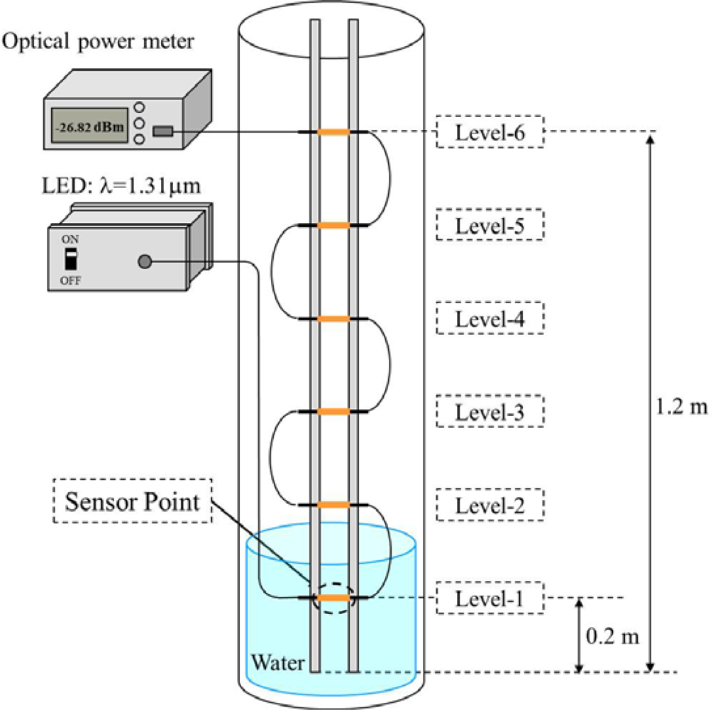 A water-level gauge can be also devised by employing a number of vertically arranged sensors which are connected in tandem, as shown in Figure 8. An identical loss is given to all sensors so that the sum of losses indicates the water level increase. Resolution of the water-level can be given as 0.2 m for this case, and be selected by changing the number of sensors per unit length which are placed in a stepwise form. The measurement system consists of six hetero-core SPR sensors connected in tandem and the same LED-PD combination as seen in Figure 5.