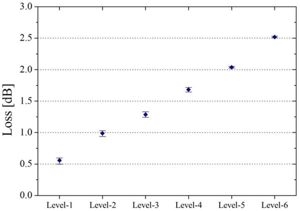 Optical losses of each water-level were measured after each sensing head was completely immersed. As can be seen, it is found that the optical loss monotonically increases with the water-level raise. The minimum loss step per sensing head immersed in water is 0.22 dB. The error bars shown in Figure 9 correspond to a reproducibility less than 0.06 m.