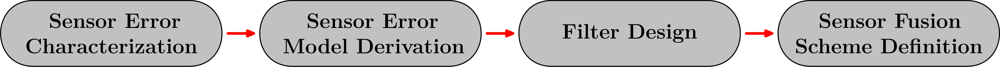 A schematic overview of the proposed E2E methodology can be seen in Figure 1. In this paper every block of Figure 1 is presented in a separate section. In the beginning of each section the applicability of each block is critically discussed and the respective theory is elaborated upon. In the first two sections on sensor error characterization and modelling the theory is directly applied to a modern prototype IMU based on MEMS components, the Imego IMT30.