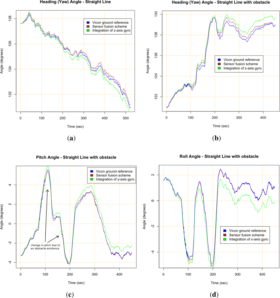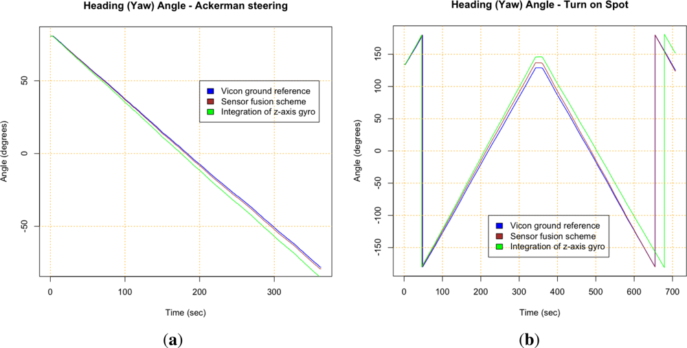 Results from the four test trajectories can be seen in Figures 9 and 10, where results of the Vicon system, the sensor fusion scheme and integration of gyros are compared. Integration of gyros are dominated by the drift. Table 6 also summarizes the maximum error between the Vicon reference measurement and the output of the scheme developed with the presented methodology (brown versus blue lines in figures). Figures 9(a) and 9(b) show that gyros bias instability is the main error for straight maneuvers as it was expected. Figures 9(c) and 9(d) depict good results for pitch and roll from the fusion of accelerometers and gyros using the QR estimator. Figure 9(a) and 10(a) show that results in the heading are better for the straight path than for the Ackerman steering. This is due to the fact that the scale factor error influences the measurement when measuring rate rotation. The scale factor error of the gyros was not possible to properly characterize since a rate-table was not available at the time of the error characterization tests. The results depicted in Figure 10(b) confirm this, indicating that the scale factor is the dominant gyro error for the sensor fusion scheme when the rover performs turning maneuvers (see Table 6).
