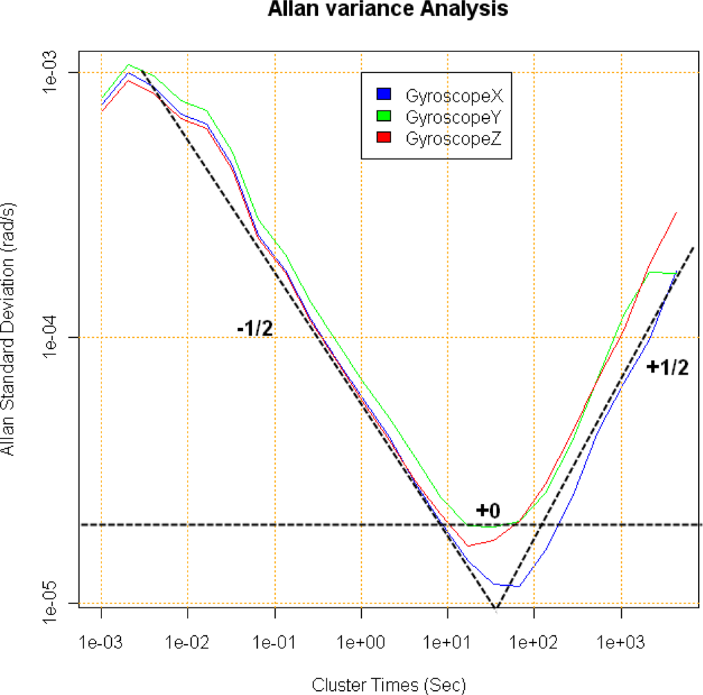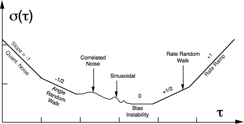 The Allan variance σ2(τ) provides direct information on the type and magnitude of various noise terms by splitting static measurement values into clusters. A statistical variance is computed among clusters of same size by taking collected values. The Allan variance of a cluster time of length τ is estimated as: