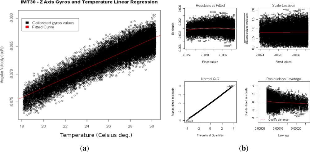 As mentioned before, MEMS inertial sensor are likely influenced by the temperature. Temperature variation directly affects sensor bias and therefore will influence in the final analysis. Thermal drift needs to be identified and compensated in order to precisely characterize the stochastic errors underlying the sensor signal. Thermal drift for the gyroscope of the IMT30 was performed and analyzed, and is presented in Table 1 and shown in Figure 3. A simple linear regression perfectly fits the thermal drift.