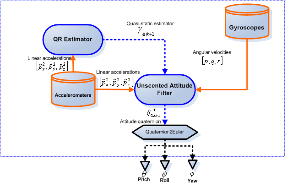 The architecture of the proposed sensor fusion scheme can be seen in Figure 6, where both the accelerometers and the gyros of the IMU are utilized and separate Kalman filters are implemented. The Unscented Attitude Filter (UAF) uses a quaternion based on Equation (10) and a system model based on Equation (13) for the estimation of the rover’s pitch, roll and yaw angles. It utilizes the accelerometers as inclinometers to correct the pitch and roll estimations in the correction step of the filter. A Quasi-static Regime Estimator (QR) similar to implementations in [6,19] is incorporated in the scheme. It estimates the dynamic/static regime of the rover by matching the measured gravity vector to the one already pre-programmed in the algorithm (theoretical value based on rover location) and thus gives an indication as to whether the accelerometer readings are reliable for the UAF correction step. QR system model is defined to estimate the instantaneous gravity magnitude as: