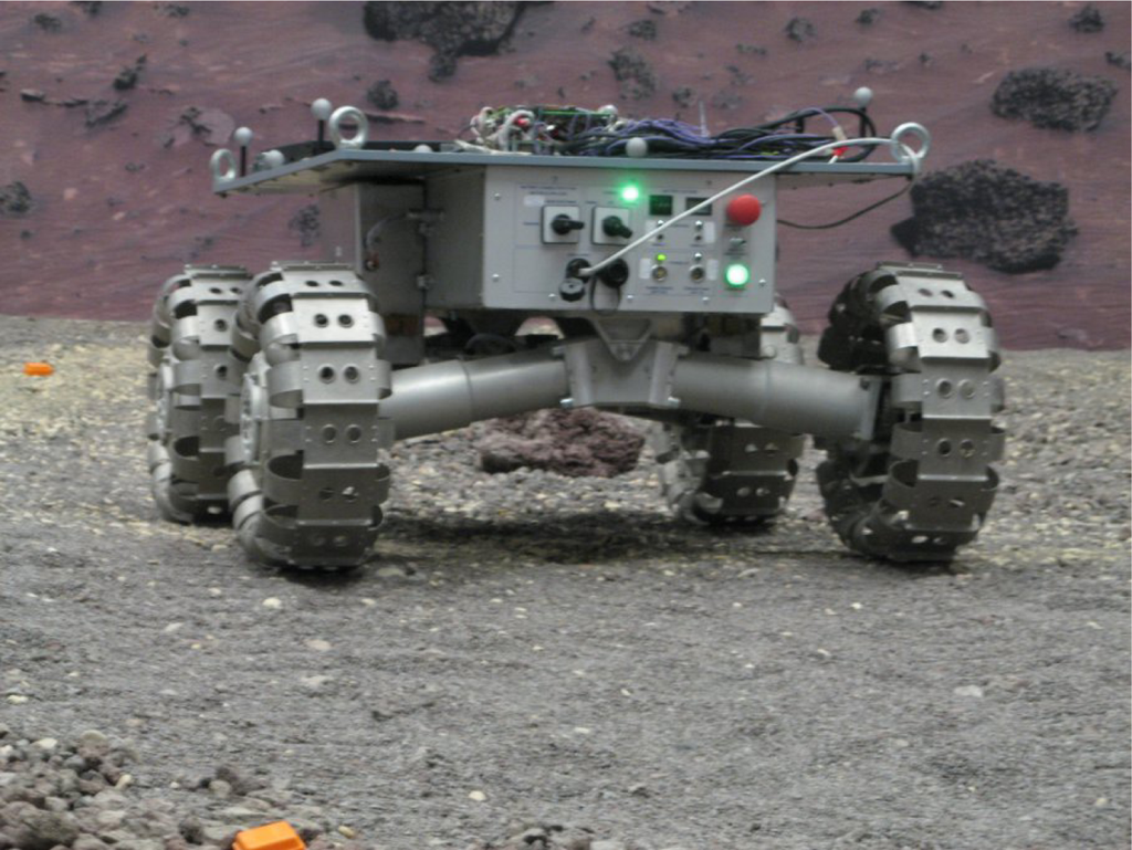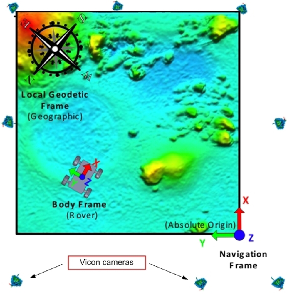 The tests were carried out at the ESTEC PUTB, a 9 m × 9 m testbed that resembles a planetary surface (see Figure 7). Around the PUTB a set of eight infrared emitting and sensing cameras are mounted to the walls, which sense reflective markers mounted on rover platform. These cameras are part of the Vicon [20] system which can deduct and track position and orientation of objects equipped with such reflective markers. The precision in the attitude measurement precision of the Vicon system in the PUTB setup is in the order of 0.1°–0.2°. A planetary rover breadboard, the Lunar Rover Model (LRM) developed by ESA for engineering investigations of locomotion capabilities, was used as a representative platform to mount the IMT30 IMU for the tests (see Figure 8).