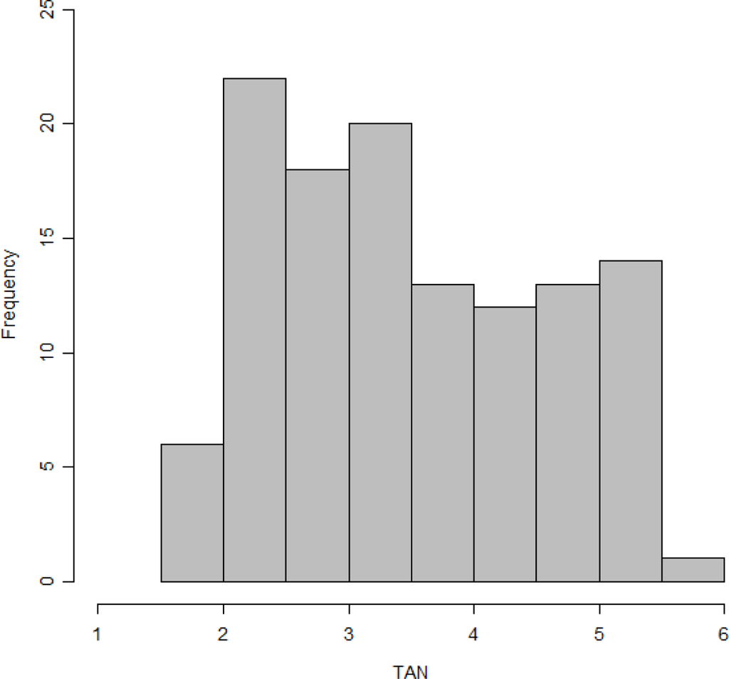 The validation statistics including the modelling parameters of selected models are listed in Table 1. Models 1 to 6 are the PLS models while models 7 and 8 are from iPLS. From the Figure 1 it can be seen that the frequency of the TAN values is not even. An even spread of values would give a more robust calibration model [17].