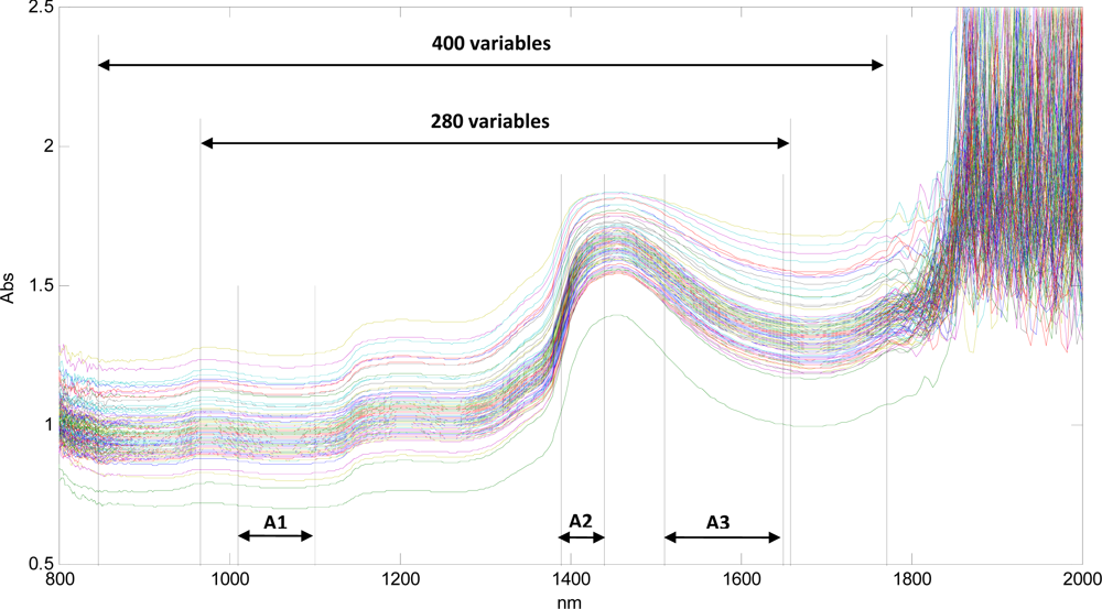 Figure 2 is a spectral plot of the absorbance vs. the wavelengths (in nanometers) for all scanned samples and gives an overview of the various spectral regions used for constructing models in this study. The raw data obtained from the NIRS included noise, and the noisy sections of the spectra were removed after visual inspection and reduced to 400 variables in the region of 847.2 nm to 1,770.8 nm. At the same time, the plot of the raw spectra showed one scan that seemed very different from the others, and this scan was removed as an outlier. Three other samples with high residuals and Hotelling T2 values were also excluded. An example of the results plot obtained from the PLS modelling done using the Unscrambler Version 9.8 software, is shown in the supplementary section.