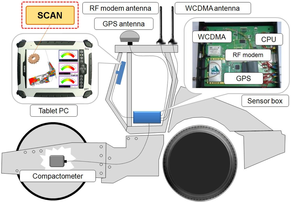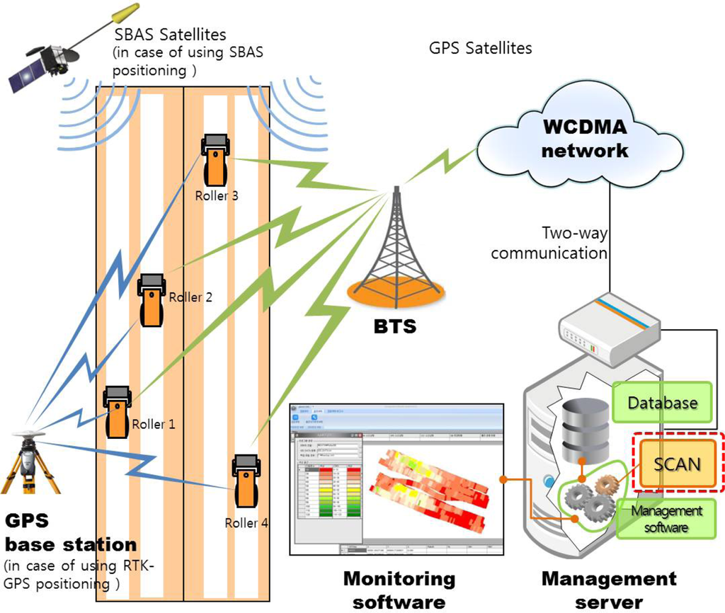 SCAN is designed to be used as a compaction data analysis module for an IC system that monitors many rollers simultaneously. Each monitored roller is equipped with GPS, a compactometer and wireless communication modems and sends compaction information to the management server in real time. Figure 1 shows the overall configuration of the IC system that uses SCAN.