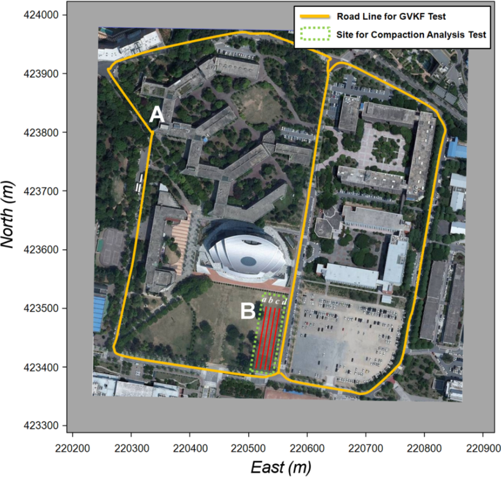 GVKF and SCAN’s capability was tested and evaluated for its improvement of positioning accuracy and analysis of compaction properties obtained by a roller trajectory modeling with a low cost GPS receiver. For this evaluation, two tests were performed: (1) a utilization test for GVKF capability to improve positioning accuracy of the result provided by the low cost GPS receiver used by the SPP and SBAS signals mounted on a moving vehicle, and (2) a utilization test for SCAN (with GVKF), analyzing the roller trajectory and compaction properties from the roller’s low cost GPS results which result in precise compaction control work of the IC under similar compaction work environments. Figure 10 shows the selected test sites for the utilization tests of GVKF (site A) and SCAN capability (site B), respectively.