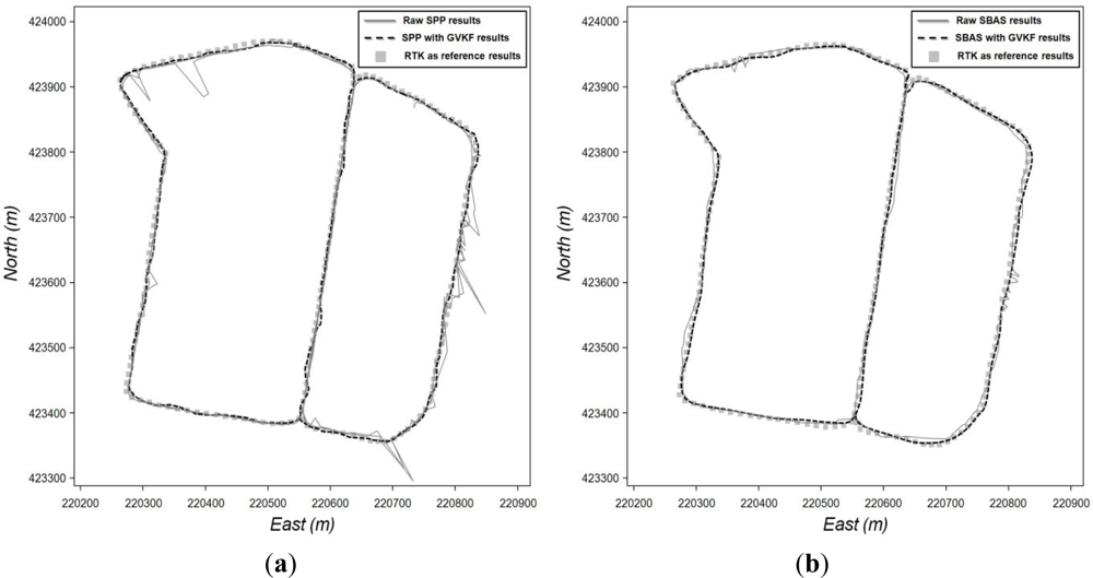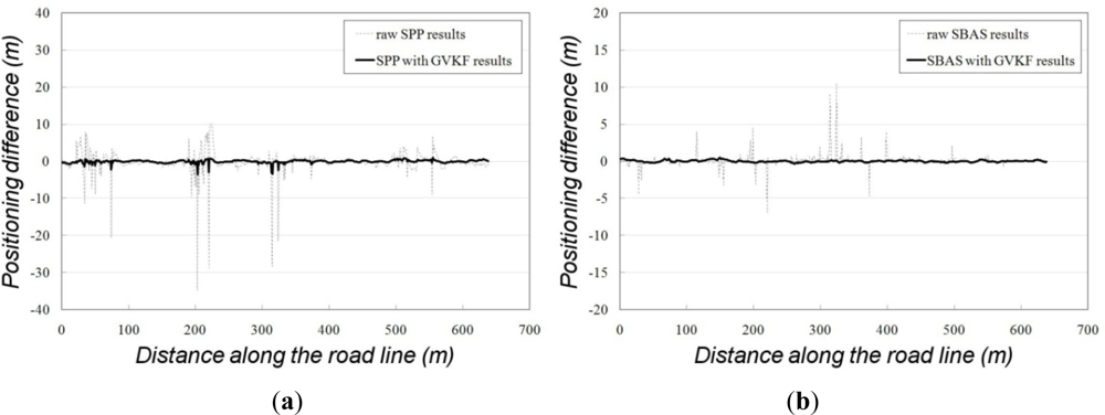 The first step of the utilization test of GVKF was surveying the center of the selected road line (site A in Figure 10) by RTK positioning and using the RTK results as reference values for accuracy evaluation of low cost GPS results and those with GVKF respectively. Then, we drove the vehicle across the road in a variety of GPS reception environments and obtained SBAS and SPP results with respect to the center of the road line using the low cost GPS receivers. The raw SPP, raw SBAS results and those with GVKF results will be compared with the RTK results in order to evaluate GVKF capability to improve the accuracy of the low cost GPS positioning. Figure 11(a) shows the raw and GVKF applied results from SPP positioning and Figure 11(b) shows those from SBAS positioning based on the RTK results.
