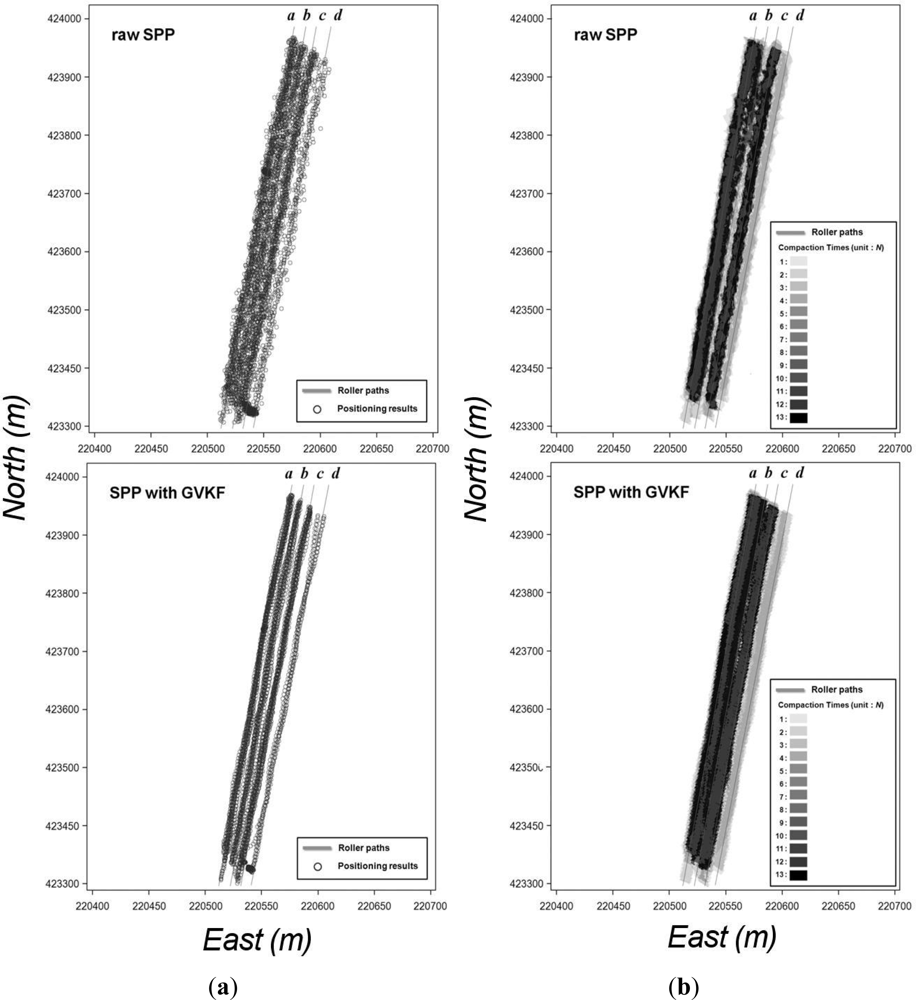 Finally, each result of compaction analysis was compared using three types of GPS positioning (SPP, SBAS and RTK) together with the GVKF-filtered SPP and SBAS results in order to evaluate SCAN capability for precise compaction analysis. Figures 13 and 14 show the results of assessment for improving the possibility of the SPP and SBAS positioning result's usage, respectively, at the precise compaction control work.