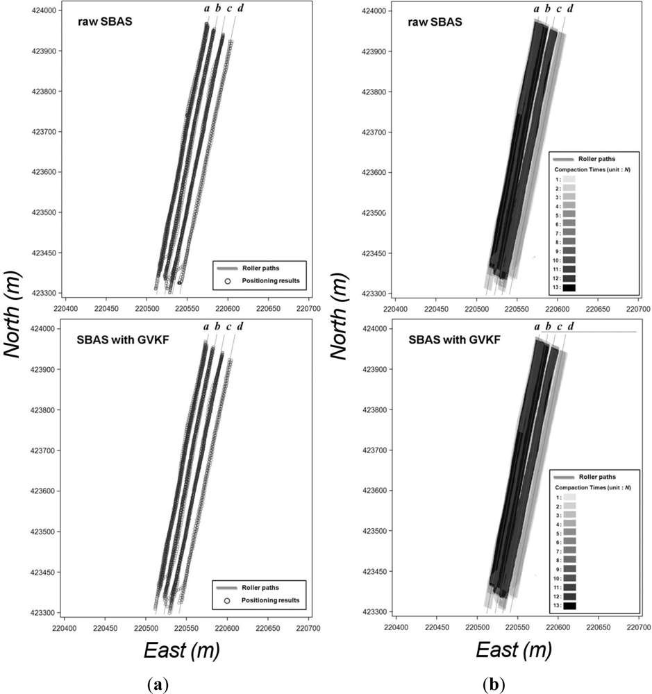 Table 5 shows the accuracy assessment result for the GVKF-filtered SBAS and SPP results. It is seen that the overall positioning accuracy is better than that for results of the previous road line test because the GPS signal reception environment is good. In addition, the effect of GVKF is slightly reduced in this test because the moving speed of the compaction roller is lower than that of the vehicle.