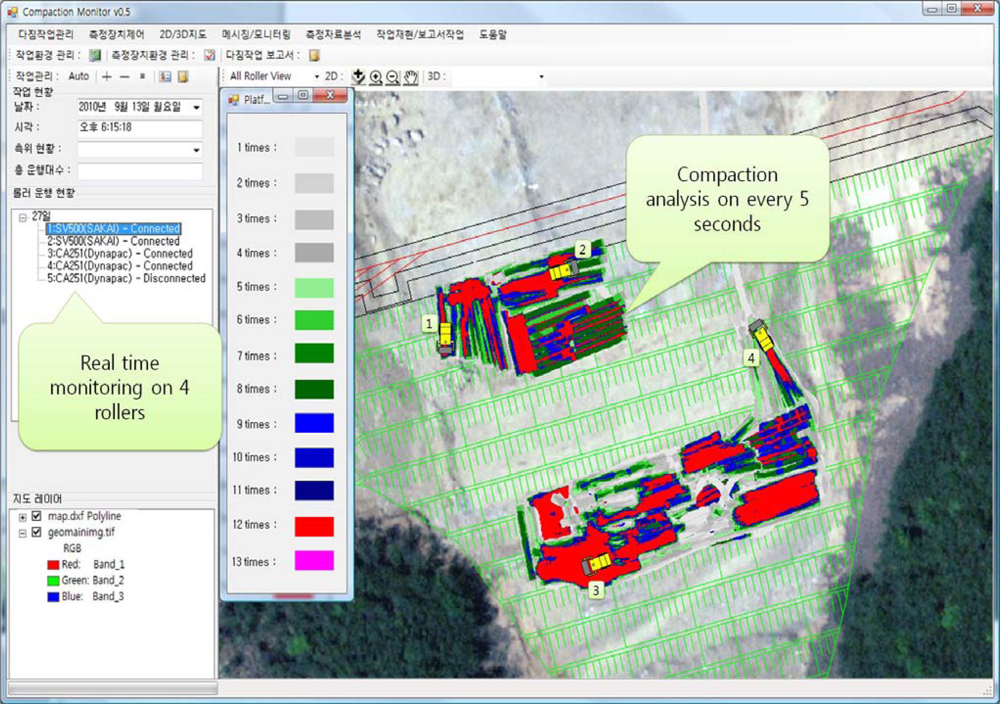 Figure 15 shows a screen capture of the monitoring software. In the figure, four rollers are sending data at one-second intervals, moreover the monitoring software analyzes the data and displays the analysis results every five second. The test results show that SCAN is adequate for real-time analysis for soil compaction monitoring using data from multiple rollers.