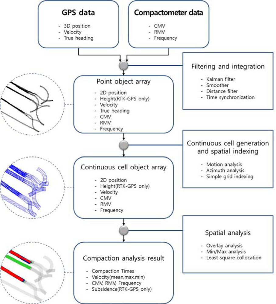 The main process includes three steps: (1) generating point-type spatial objects by converting and integrating data from GPS and the compactometer mounted on a roller; (2) converting point-type data to continuous quadrangle cell-type spatial objects and building a spatial index; and (3) producing compaction results through statistical and spatial analysis.