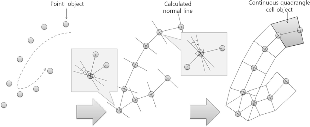 Figure 5 shows the algorithm of converting point objects to cell objects using two steps. First, the azimuth angles perpendicular to the connect lines between the first and second point and between the second and third point were calculated. Next, the average of the two azimuths to determine the azimuth of the second point was configured. This process was iterated to calculate each azimuth for every point.