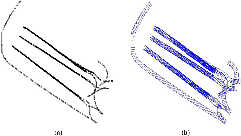 Figure 6 shows the result of generating continuous quadrangle cell objects (Figure 6(b)) from point objects (Figure 6(a)) by the spatial object modeling methods suggested in this study. In this figure, the quadrangle cell objects that describe the roller’s actual continuous motion were successfully generated.