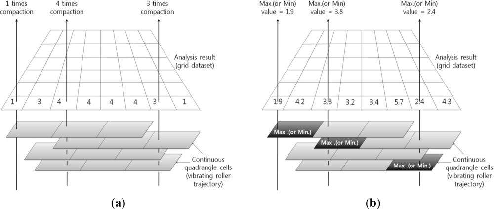 In Step (1), GPS coordinates are filtered by three filters, GPS velocity based on the Kalman Filter (GVKF), the smoother, and the distance filters, to reduce errors on GPS coordinates and to ensure ease of generating a continuous quadrangle cell. The height data of the GPS coordinates are often used when using RTK-GPS positioning, but they can be neglected when using other positioning methods (SBAS positioning or SPP) because the accuracy of the height coordinates in such methods is low. Then, the filtered GPS data and compactometer data are integrated on the basis of time to be converted into point-type spatial objects. In Step (2), using properties of point objects, 2-D coordinates, grid azimuth and time, the movement of a roller is analyzed and continuous quadrangle cells are generated. These cells can successfully model the roller’s continuous path of movement and includes every datum gathered by the GPS and compactomter to be adequate for soil compaction analysis. Finally, spatial indexes are generated for cells for fast data finding and analyzing. In Step (3), some spatial analysis is performed using cell objects to obtain analysis results for investigating compaction states of the ground. Then, the final result with the analysis result of the whole area is calculated by least square collocation.