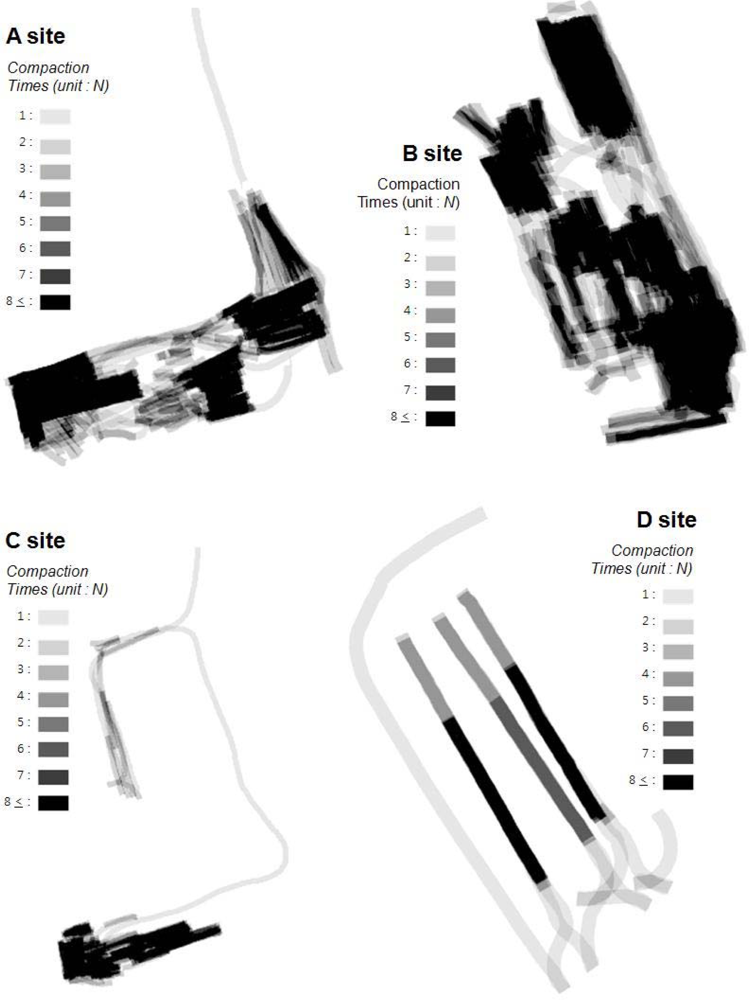 Sample data gathered from five different sites (A, B, C, D, E) were processed to verify the accuracy of analysis from SCAN. Figure 8 shows the analysis results of the number of roller passes (compaction times) from four sites (A to D). A path with more than eight roller passes is displayed with a very dark color. Paths with less than seven roller passes are shown with lighter colors.