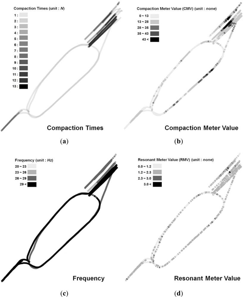 Figure 9 shows analysis results of the number of roller passes, compaction properties, CMV, RMV, and vibration frequency using data from a roller at site E. The roller was operated at 20, 26, and 30 Hz, and there was a maximum of twelve roller passes at site E. Especially, Figure 9(b) shows the CMV and relative degree of compaction obtained from the compactometer. The CMV of the area through which the roller had passed at least four times was generally greater than the CMV of the other areas. Thus, the number of passes, the vibration frequency, the CMV varying from 0 to 80, and the RMV varying from 0 to 4 were effectively displayed by SCAN in order to characterize the state of roller compaction at site E.