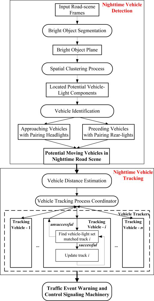 The proposed vision-based intelligent nighttime driver assistance and surveillance (VIDASS) system integrates effective vision-based sensing and processing modules, including nighttime vehicle detection, collision warning determination, and event recording functionalities. These functions are implemented to identify target vehicles in front of the host car, estimating their distances, determine possible collision accidents, and record traffic event videos. The real-time vision-based sensing and processing modules of the proposed VIDASS system include bright object segmentation, spatial clustering process, rule-based vehicle identification, vehicle distance estimation, and traffic event warning and control signaling machinery. The following subsections describe these features. Figure 1 shows a flow diagram of the proposed vision processing modules for the VIDASS system.