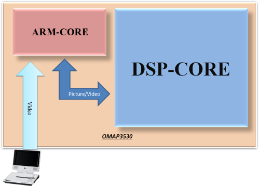 The proposed VIDASS system includes a set of vision-based modules and subsystems as described in the previous section, and these vision modules require an embedded portable platform that can provide efficient and optimized video-intensive computational resources and feasible embedded software development tools. For the aspects of hardware platform selection, the ARM general processors are famous for their low cost, low power consumption, extensive general-purpose IO control facilities, and sufficient OS awareness. However, the hardware architecture of ARM processors is designed to support general-purpose applications, and is therefore unsuitable for multimedia applications, such as image and video processing applications that cost large numerical computations on a large amount of multimedia data. In contrast, a digital signal processor (DSP), such as Texas Instruments (TI) C64x+ series, can provide optimized and accelerated computational instructions and units for video-intensive algorithms and multimedia data processing applications, although it lacks sufficient OS awareness compared with ARM processors. Thus, a complementary combination of the ARM general processor and the digital signal processor can provide a best-fitted solution for developing a vision-based system with the embedded OS, GUI module, and peripheral IO control facilities. In this way, we can divide the VIDASS system into a set of execution modules on the ARM and DSP processors according to their functional and computational properties to obtain effective performance and economic hardware costs.