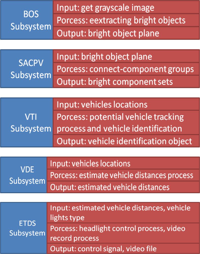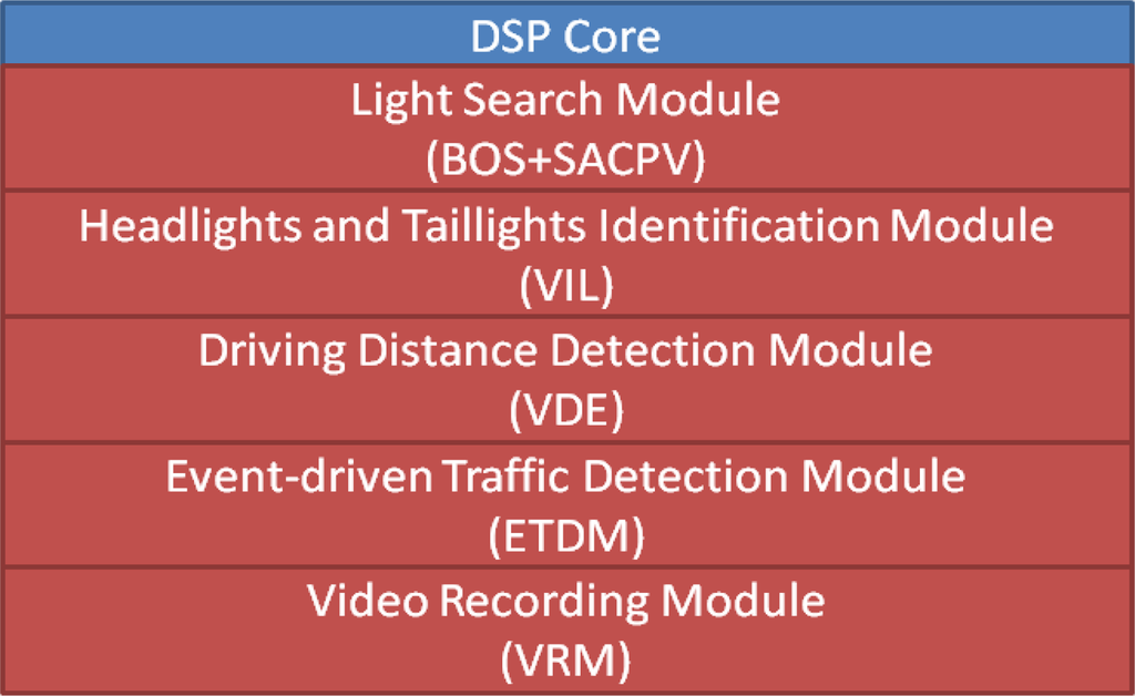 The BOS module then exports the obtained bright object plane to the following stage. In the second stage, the SACPV module receives the bright object plane from the BOS module, applies a connected-component extraction process to group the bright objects into meaningful sets, and then sends out the resulting bright component sets. The third stage is the VIL module, which obtains the bright component sets from SACPV module and performs the rule-based identification process to detect and verify the oncoming and preceding vehicles. The VIL module then sends the detected vehicles and their locations out to the VDE module. In the fourth stage, the VDE module determines the relative distances between the host car and the detected oncoming and preceding vehicles, and then provides the estimated vehicle distances to the following stage. The final stage is the ETDS module, which performs and activates the headlight control process and activates the traffic event video recording according using the MPEG4 codec implemented by the DSP codec library [36,37] based the information of detected vehicles and their related distances.