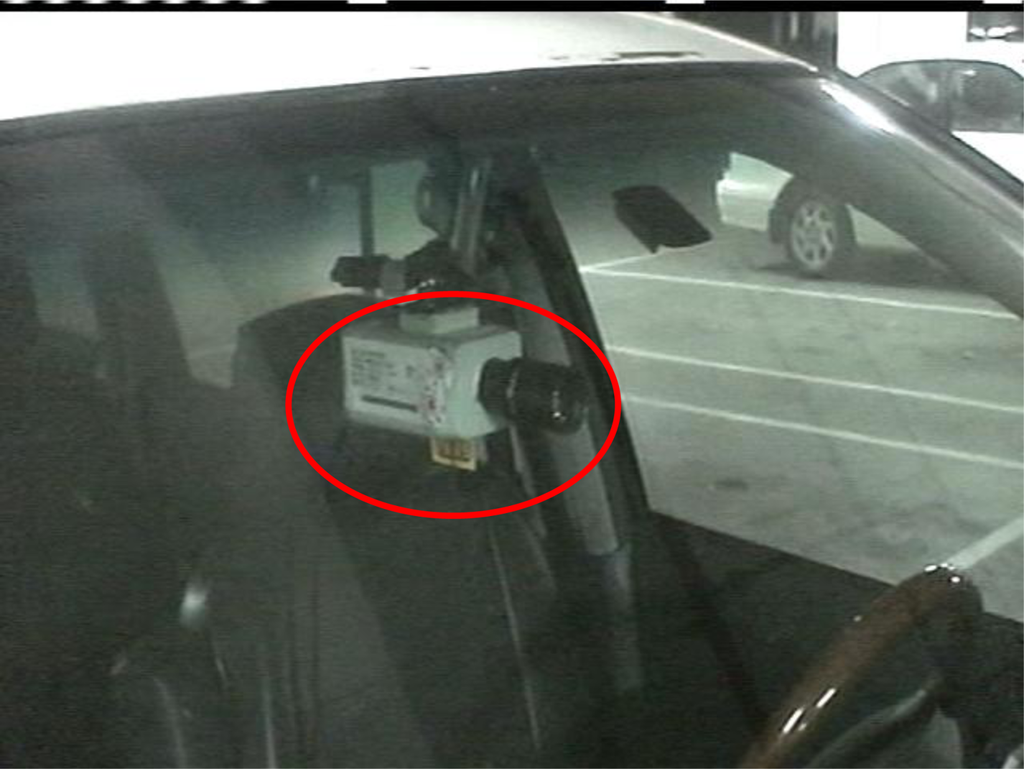 The proposed vision-based techniques and modules of the VIDASS system were integrated and implemented on a TI IMAP3530 ARM-DSP dual-core embedded platform, which was set up on an experimental camera-assisted car. To make the proposed system operate well, the CCD camera for acquiring input image sequences of front road environments is mounted behind the windshield inside the experimental camera-assisted car with a sufficient height for capture a suitable region for covering the interesting driving lanes to be monitored, as shown in Figure 15. Then the view angle of the CCD camera is calibrated to be parallel to the ground for obtaining reliable features of target vehicles and the relative distances to them. In our experimental platform, the CCD camera is set at a 1.3 m height to the ground and parallel to the ground with an elevation angle of zero degree, while the focal length of the CCD camera is set as 10 mm. The peripheral devices, including image grabbing devices, mobile communication modules, and other in-vehicle control devices, were also integrated on the ARM-DSP dual-core embedded platform to accomplish an in-vehicle embedded vision-based nighttime driver assistance and surveillance system. The proposed vision system has a frame rate of 10 fps, and the size of each frame of captured image sequences is 720 pixels × 480 pixels per frame. The proposed system was tested on several videos of real nighttime road-scenes under various conditions.