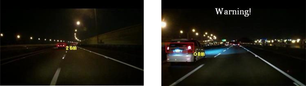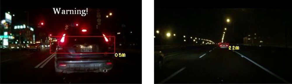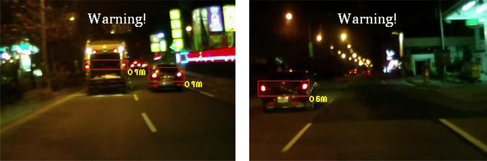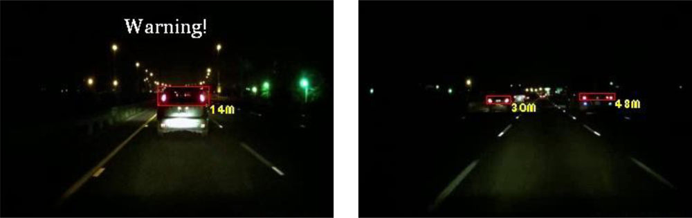 In addition to quantitatively evaluating the vehicle detection performance of the proposed system, this study evaluates the detection accuracy of possible collision warning events of the ETDS module. The proposed system issues timely warnings to the driver to slow to avoid collision dangers, and automatically activates the traffic event recording process. Table 2 shows the quantitative detection accuracy data of the possible collision warning events of the proposed system. This table shows that the proposed system can achieve high detection accuracy of warning condition determination. The average event detection accuracy reaches 93.3% for different nighttime road environments with various lighting conditions and traffic conditions. Accordingly, the high detection accuracy on warning events demonstrates that the proposed system enables timely collision avoidance, and efficient storage usage for traffic event data recording.