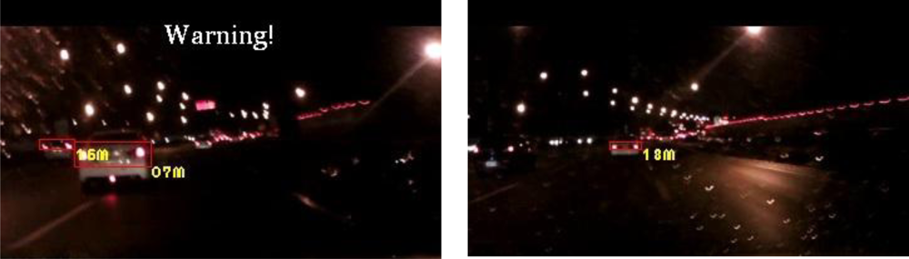 First, the experimental videos in Figures 17–19 (Test videos 1–3) are evaluated at nighttime rural roads under normal and dim lighting conditions with free traffic flows. The snapshots in Figures 17–19 show that the proposed system correctly detects most of the preceding and oncoming vehicles, estimates their distances to the host car, and warns the driver to avoid possible collision dangers under different illumination conditions. The system also activates the event recording process when the host car drives too close to the target vehicles ahead.