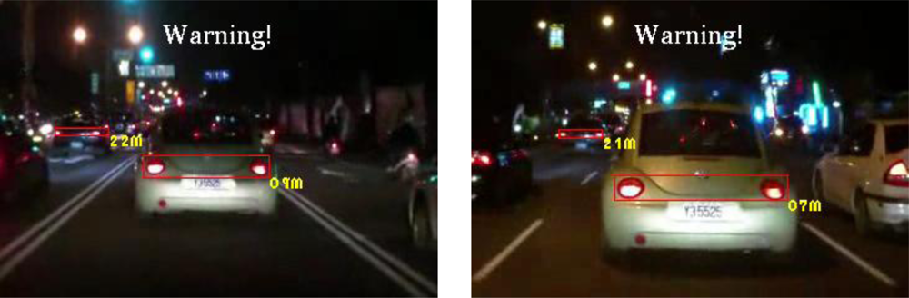 The types of ambient lighting conditions in the experimental videos include normal illumination conditions, bright illumination conditions, and dim illuminations. Experimental videos in the normal illumination conditions were captured in the normal lit road environments, where the lighting sources are streetlights and vehicle lights. Experimental videos in the bright illumination conditions were captured in the highly lit urban road environments, where the lighting sources comprise of large amount of streetlights, building lights, neon lights and vehicle lights; while dim illumination videos were captured in unlit highway or rural road environments with only a few streetlights and vehicle lights. Each video lasted approximately 5–10 min. The locations of the detected preceding vehicles in the experimental samples are indicated by red rectangles, whereas the oncoming vehicles are labeled as green rectangles. When the host car comes too close to the detected preceding vehicles, the ETDS process warns the driver to slow to avoid collision dangers, and activates the traffic event recording process. When the proposed system detects oncoming vehicles, the ETDS module automatically switches the headlights from high beam to low beam.