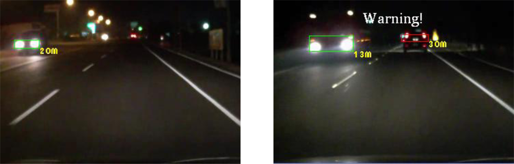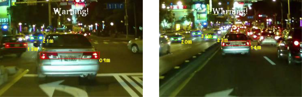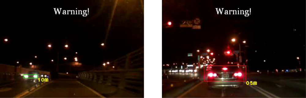 For computational timing issues, the computation time required to process one input frame depends on the complexity of the traffic environment. Most of the computation time is spent on the spatial clustering process (including the connected component analysis) of potential lighting objects. Based on a TI OMAP3530 ARM-DSP embedded platform, the vision computing modules of the proposed VIDASS system require on average 70 milliseconds to process a video frame measuring 720 × 480 pixels, whereas the traffic event video recording takes approximately 10 ms per frame with hardware acceleration. The computational timing data of the vision processing modules are listed in Table 3. This computation cost ensures that the proposed system can effectively satisfy the demand of real-time processing at 12 fps (frames per second). Thus, the proposed system provides timely warnings and assistance for drivers to avoid possible traffic accidents.