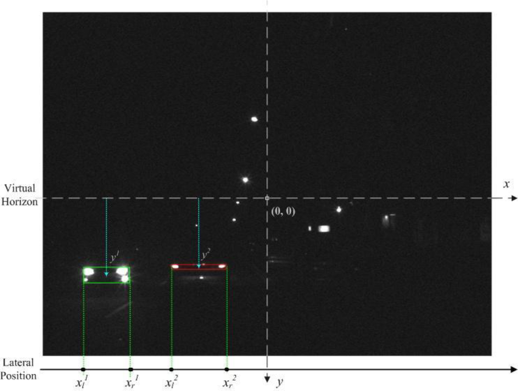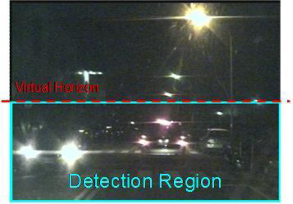 To preliminarily screen out non-vehicle illuminant objects such as street lamps and traffic lights, first filter out the bright components located above one-third of the vertical y-axis (i.e., only the bright components located under the constraint line), Thus, only the “virtual horizon” in Figure 4 is considered. This is because vehicles located at a distant place on the road become very small light “points”, and “converge” into a virtual horizon.